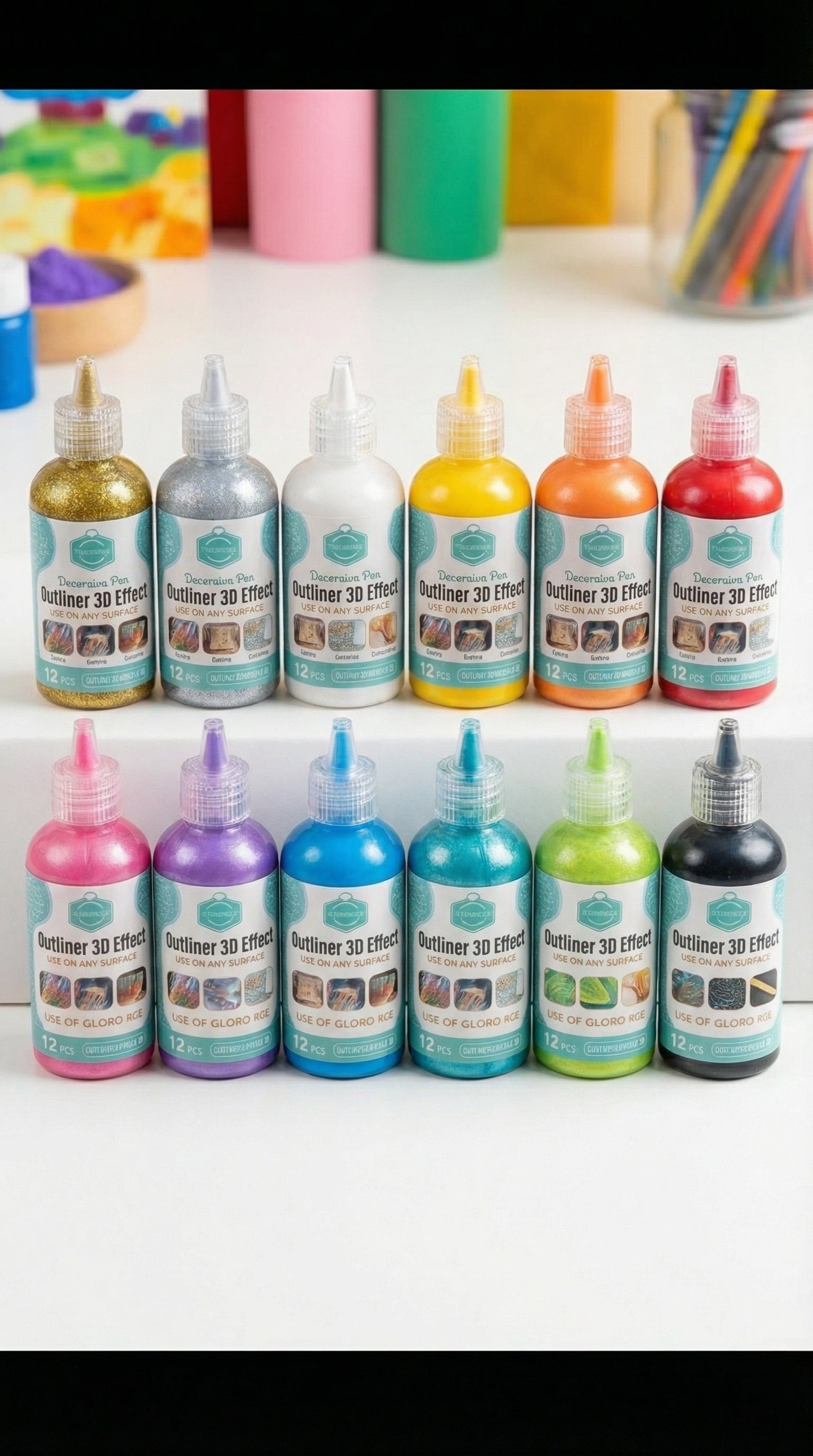 12-Piece 3D Glitter Outliner Paint Set – Non-Toxic Decorative Pens for Fabric, Glass, Wood & More.