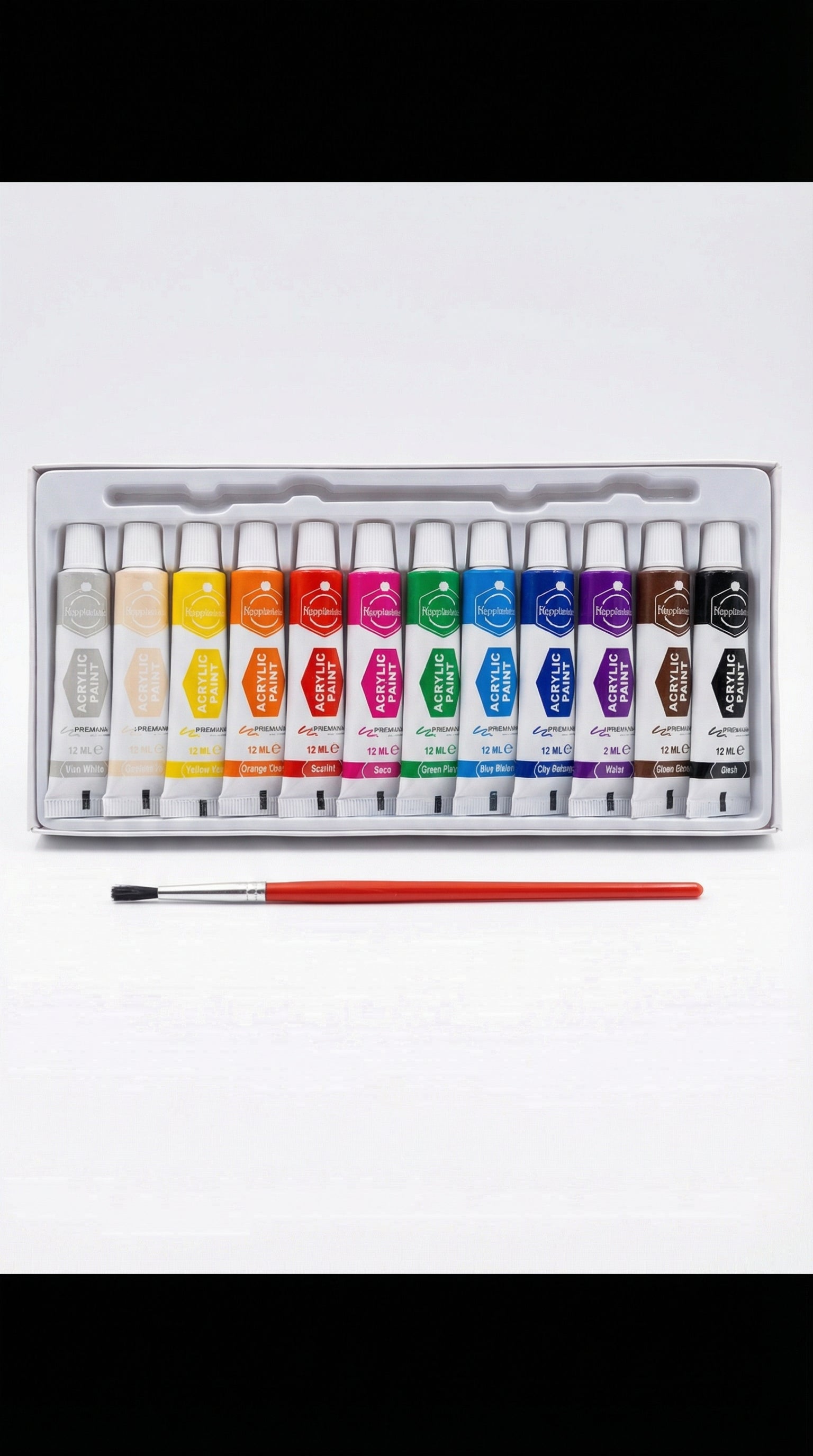 Vibrant Palette: Includes 12 essential colors in 12ml tubes.
