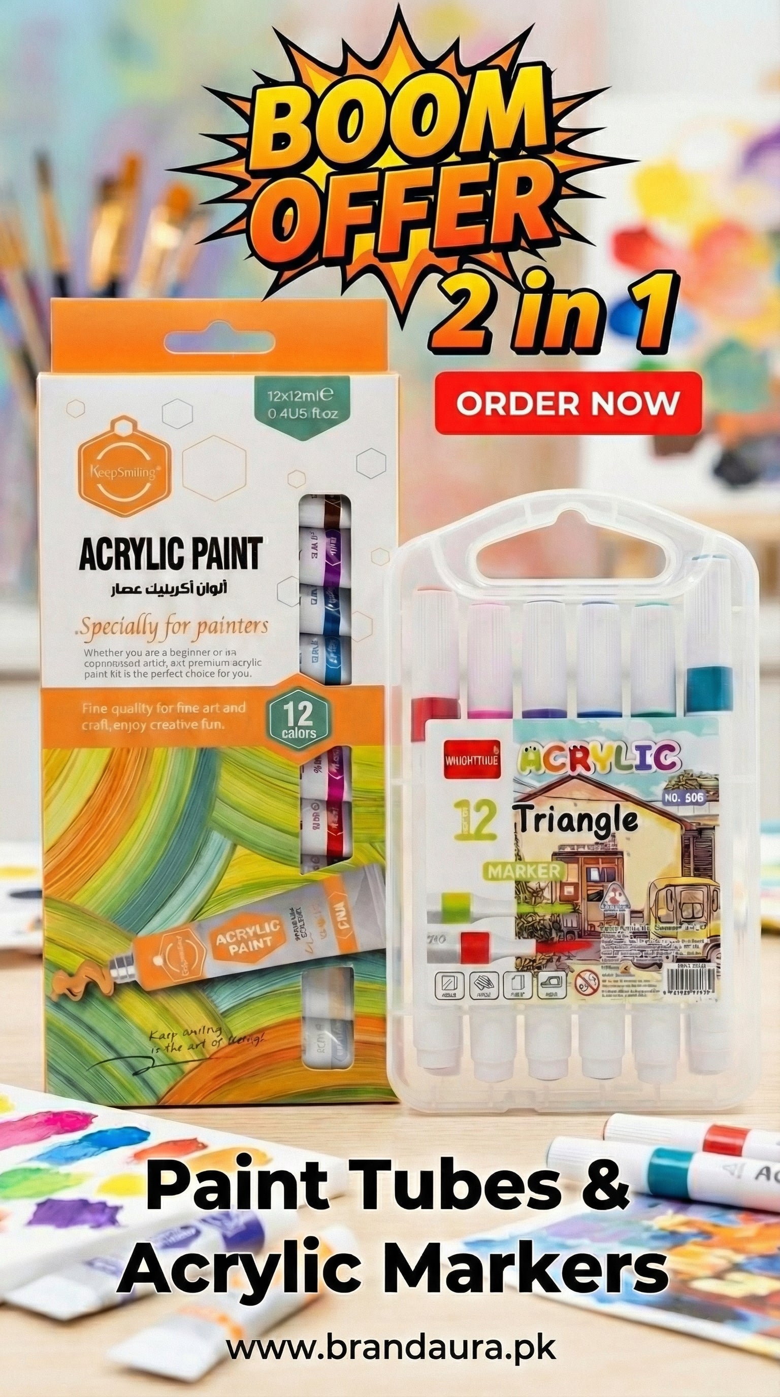 2 in 1-Acrylic Paint Set (12 x 12ml tubes) and Acrylic Triangle Marker( Pack 0f 12)